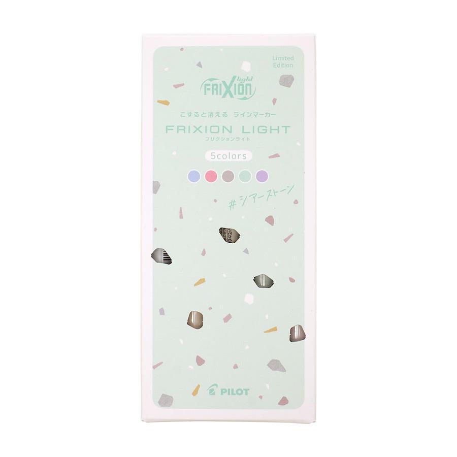 学生に人気の文房具4ブランドがコラボ!。ファッションやコスメなどで人気の優しい色合いのくすみカラーをベースに、淡く透けるような「シアーストーン」柄5色をそれぞれに採用。「淡色ストーン柄でゆるかわ大人のリンクコーデ」をテーマに、新学期に向けて学生から絶大な支持を集める各ブランドアイテムのお揃い「リンクコーデ」を楽しめます。。フリクションライトは、こすると消えるラインマーカーです。。