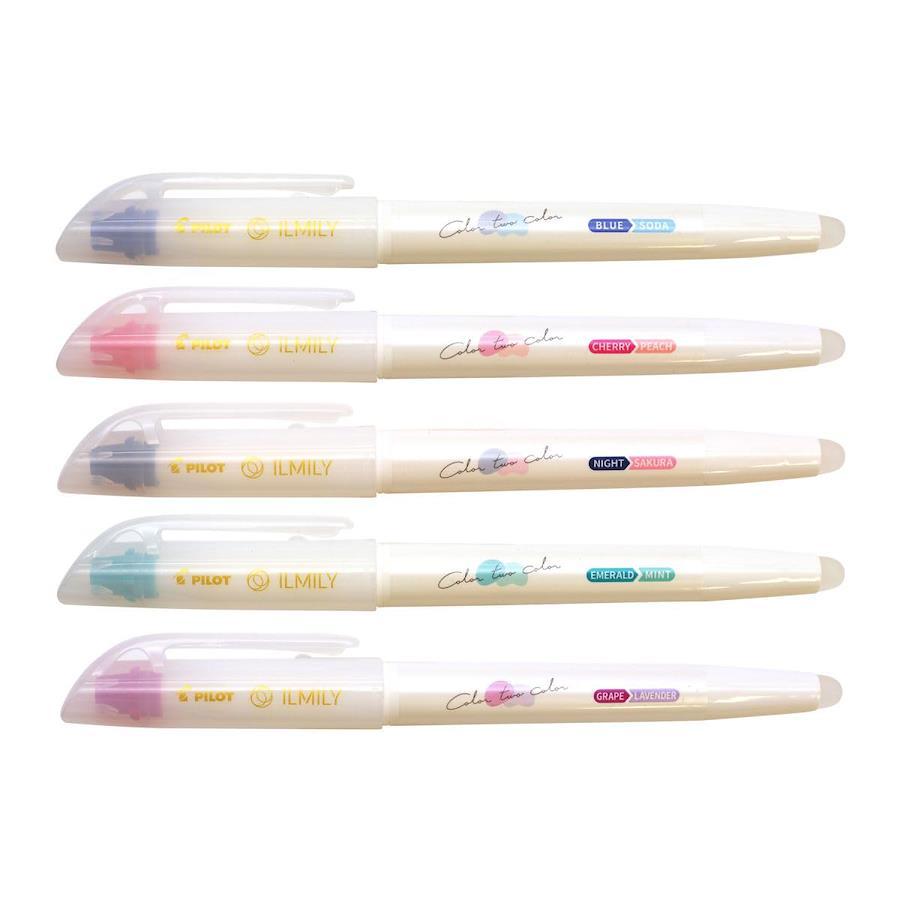 「ILMILY。Color。two。color」のマーカー。。ペン後部の専用ラバーでこすると筆跡の色を変化させることができるマーカーです。インキ色は同系色で濃い色から薄い色へと変わる3色と、数量限定の2色を加えた計5色がラインアップ。ノートや手帳へのデコレーションやマーキングはもちろん、色の変化で2色を楽しめるため紙面を華やかに彩ることができます。。※詳細画像に一部別カラーの商品を使用しています。。サイズ:縦=138mm 横=13mm 厚さ=18mm。商品色傾向:黄緑。。表紙パターン:タイポグラフィー。