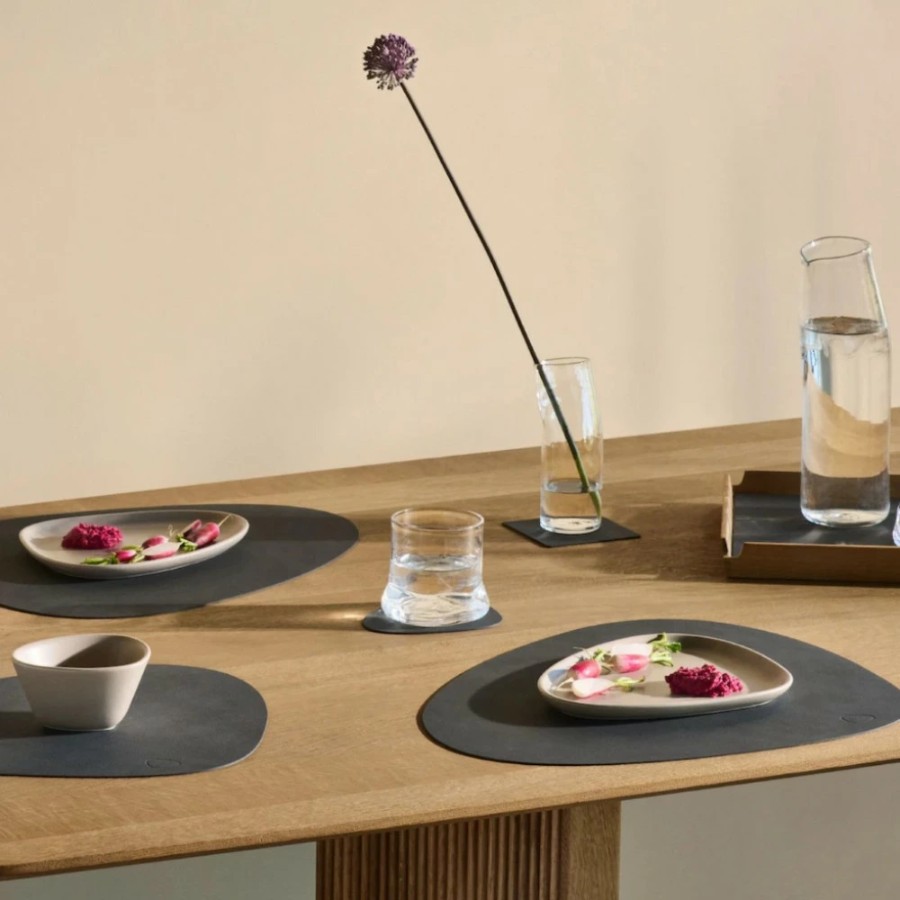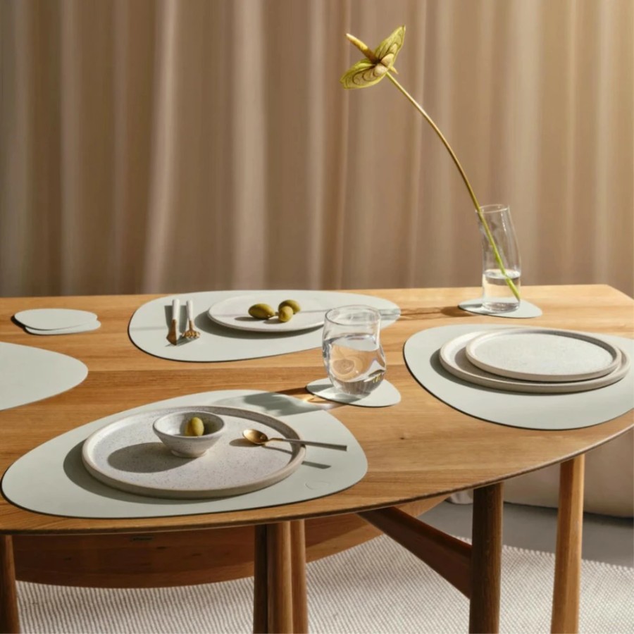 プレイスマット、コースター、フラワーベースカバーはリサイクルレザーを使う事により革の高級感と暮らしの中での使いやすさを両立。