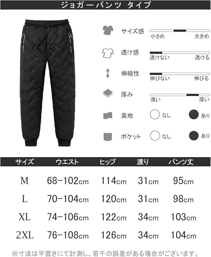 ジョガーパンツタイプ:ウエスト/ヒップ/渡り/パンツ丈/裾口 「M」68-102cm/114cm/31cm/95cm/11 「L」70-104cm/120cm/31cm/98cm/11 「XL」74-106cm/122cm/34cm/103cm/11 「2XL」76-108cm/126cm/34cm/104cm/12 ストレートパンツタイプ:ウエスト/ヒップ/渡り/パンツ丈/裾口 「M」66-98cm/112cm/31cm/98cm/18 「L」70-100cm/114cm/32cm/105cm/18 「XL」76-104cm/116cm/34cm/106cm/19 「2XL」78-106cm/120cm/34cm/108cm/20