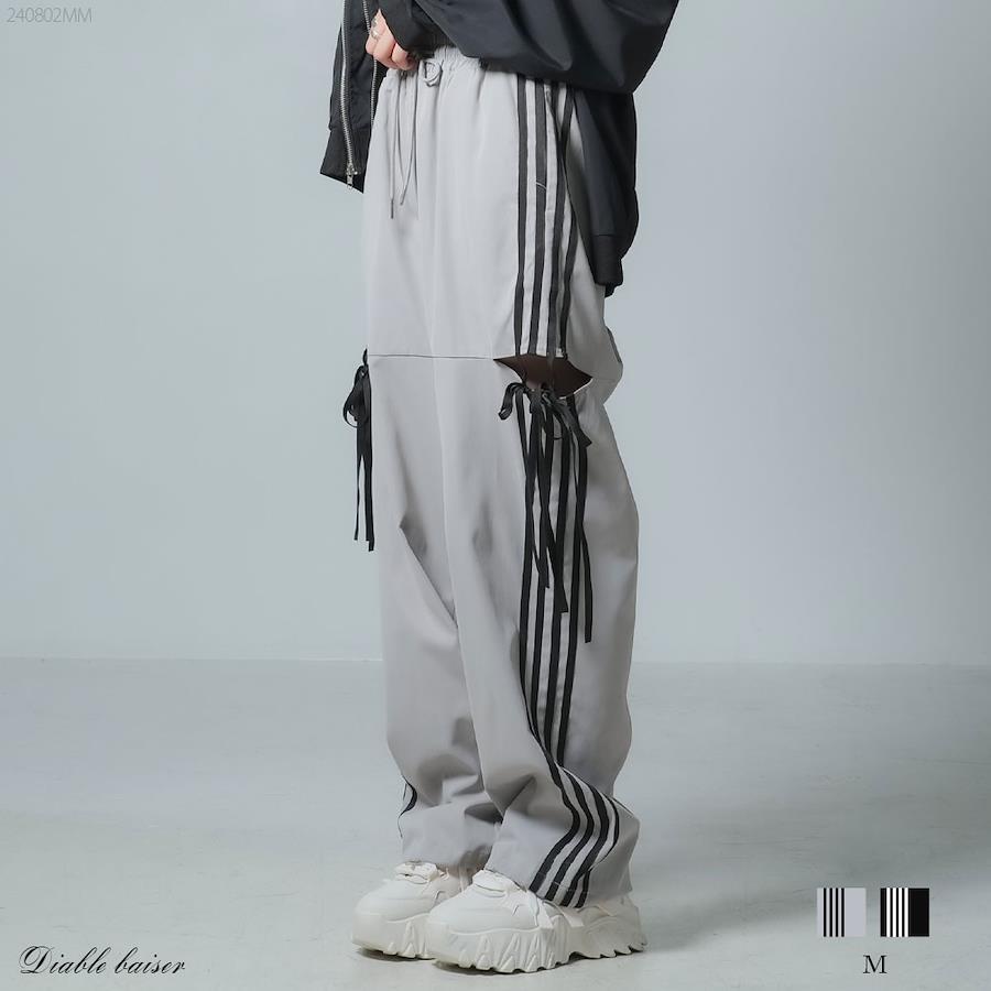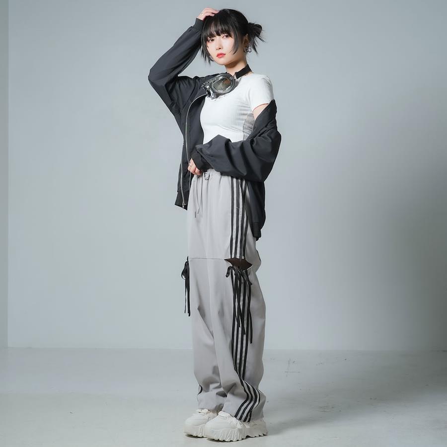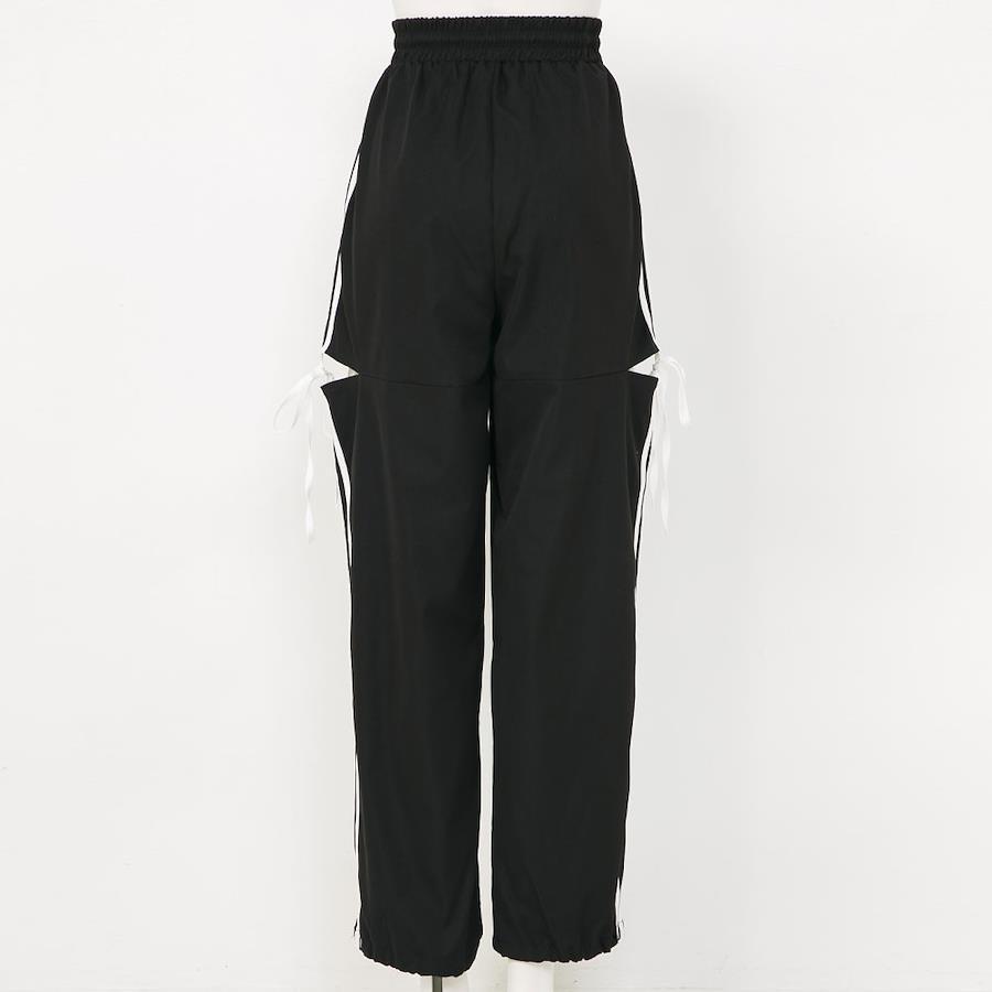 ◆Designラインリボントラックパンツは、スポーティなトラックパンツにリボンやラインのデザインを取り入れたアイテム。カジュアルながらも女性らしい雰囲気を演出。サイドにラインが入ったトラックパンツに横にスリットいれてリボンで結んでスリットの開き具合を好きなようにアレンジ。裾もドロストで絞れて2WAY仕様です。