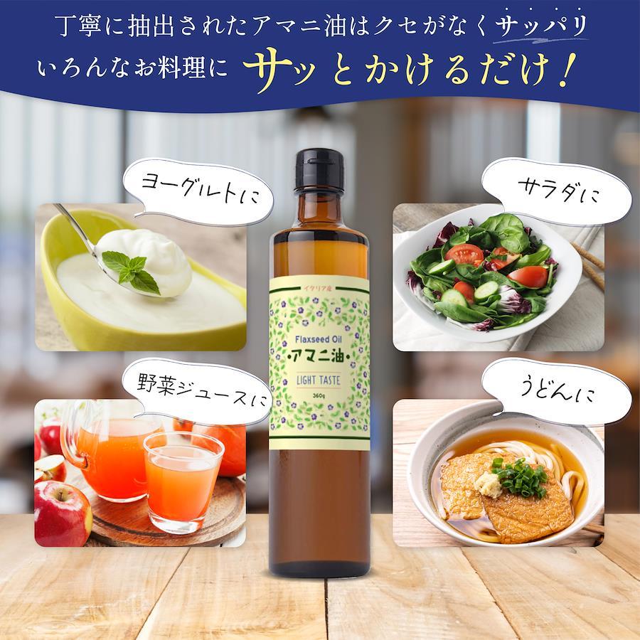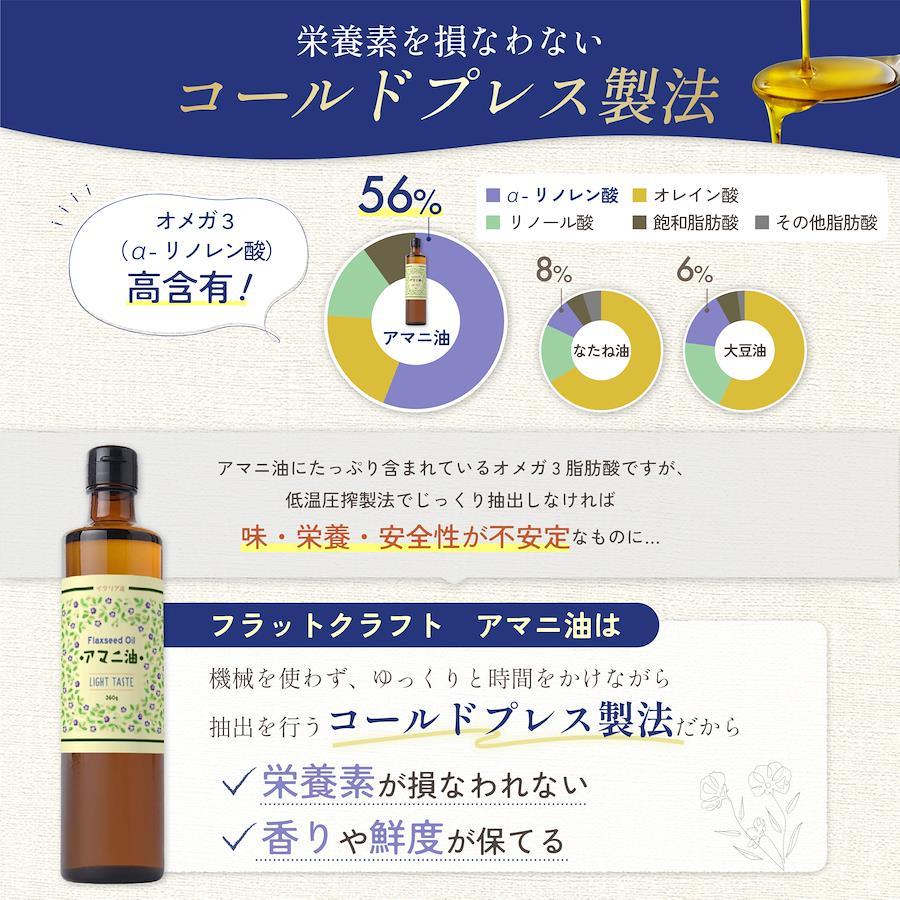 【お得な大容量 360g】【イタリア産】【 食品添加物・保存料不使用】【低温圧搾・コールドプレス製法】オメガ3系脂肪酸であるα-リノレン酸が豊富に含まれています。【優しい味】アマニ特有のクセや匂いが少なく、シニアからお子様まで幅広い年齢層の方にお召し上がり頂けます。【賞味期限 製造から18ヶ月】【輸入販売元】(株)フラット・クラフト(ギー・オイルやMCTオイルの輸入販売も手がけるオイル専門商社)。【ご利用方法】サラダやスープにかけて、またドレッシングなどにご使用いただけます。そのままでもおいしく召し上がれます。 ※炒めものなど、短時間の熱料理に使用できますが、アマニ特有の香りがでることがあります。調理後はお早めにお召し上がり下さい。※長時間の加熱や天ぷら等には使用しないで下さい。