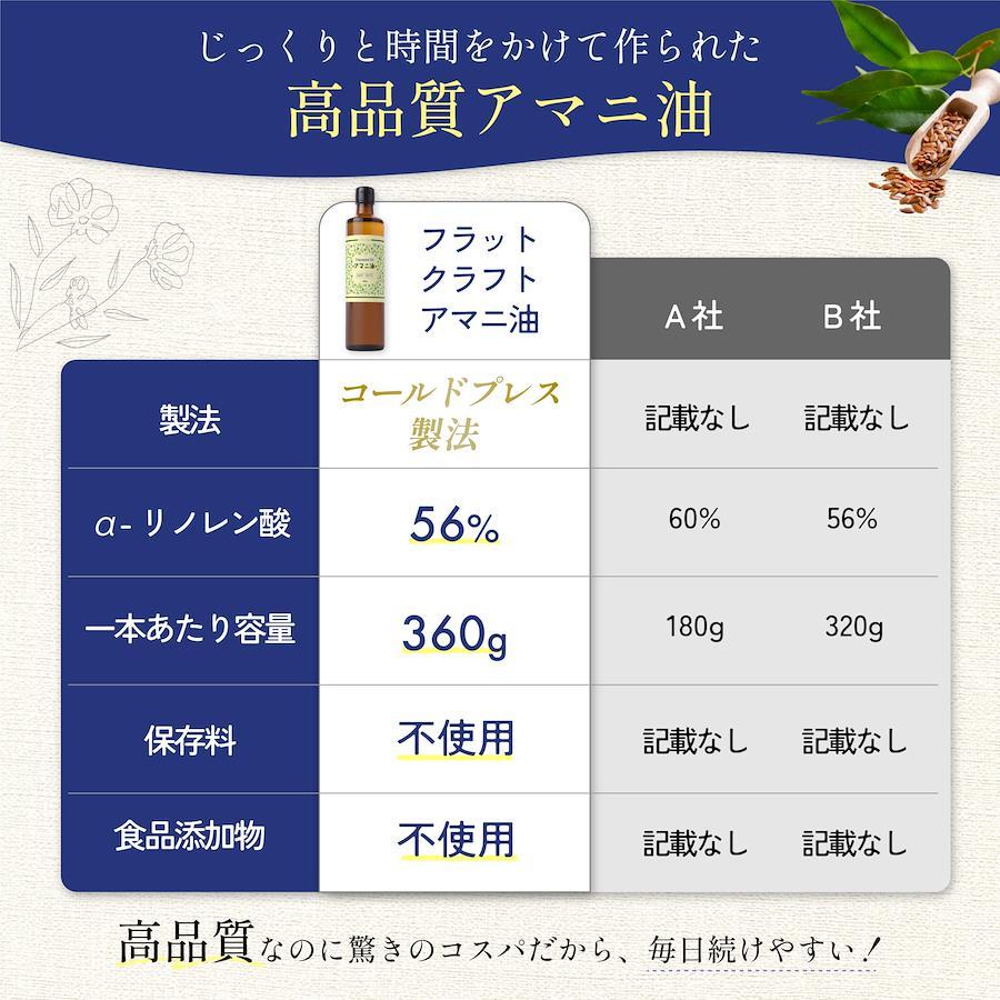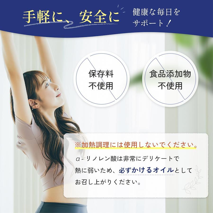 食品添加物・保存料不使用。厳選した亜麻(あま)の種子から低温圧搾(コールドプレス製法)で丁寧に搾油