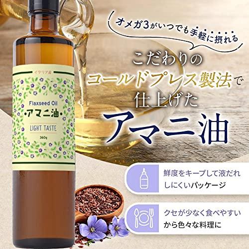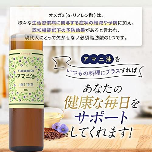 【お得な大容量 360g】【イタリア産】【 食品添加物・保存料不使用】【低温圧搾・コールドプレス製法】オメガ3系脂肪酸であるα-リノレン酸が豊富に含まれています。【優しい味】アマニ特有のクセや匂いが少なく、シニアからお子様まで幅広い年齢層の方にお召し上がり頂けます。【賞味期限 製造から18ヶ月】【輸入販売元】(株)フラット・クラフト(ギー・オイルやMCTオイルの輸入販売も手がけるオイル専門商社)。【ご利用方法】サラダやスープにかけて、またドレッシングなどにご使用いただけます。そのままでもおいしく召し上がれます。 ※炒めものなど、短時間の熱料理に使用できますが、アマニ特有の香りがでることがあります。調理後はお早めにお召し上がり下さい。※長時間の加熱や天ぷら等には使用しないで下さい。