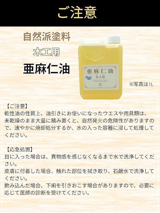 「ご注意」乾性油の性質上、油引きにお使いになったウエスや用具類は、未乾燥のまま大量に積み置くと、自然発火の危険性がありますので、速やかに焼却処分するか、水の入った容器に浸して処理してください。