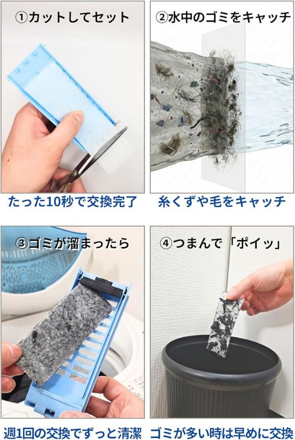 標準のネットフィルターでは通り抜けてしまうゴミを逃さないため、排水ホースの詰まりや故障リスクを軽減し、大切な洗濯機を長持ちさせます。