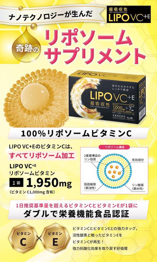 【リポソームビタミンC100%】通常のビタミンCやタイムリリースビタミンCを合計して1,000mg/日?2,000mg/日の商品が多い中、LIPO VC+Eは一袋にぎっしりリポソームビタミン1,950mg(ビタミンC1,000mg含有) 【ビタミンC & ビタミンE ダブルでで栄養機能食品認証】1日推奨基準量を超えるビタミンCとビタミンEが1袋に! 【美味しくて飲みやすい顆粒タイプ グレープフルーツ味】飲み込むタイプのサプリメントと異なり、そのまま飲んでも、ヨーグルトやドリンクに混ぜても美味しく食べられます! 【有効成分の吸収率は驚異の98%】“リポソーム”とは、人間の細胞膜と同じ”リン脂質”の膜を張ったナノカプセル。直接小腸から吸収されるため、吸収率が格段にUP!(通常のビタミンC1,000mg採っても吸収率21%とのデータも・・))※飲みやすさの工夫として甘味料を使用しておりますが、甘味料がリポソーム化されている訳ではありません。 【徹底的な高品質】日本製(原材料に一部中国製造のものを使用していますが、日本国内製造です)毎日飲むものだからこそ、GMP認定工場での製造はもちろん、徹底的に品質にこだわったリポソームビタミンC&ビタミンE。成分分析試験実施済み!