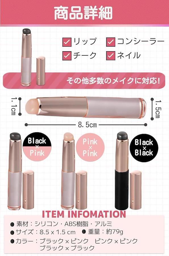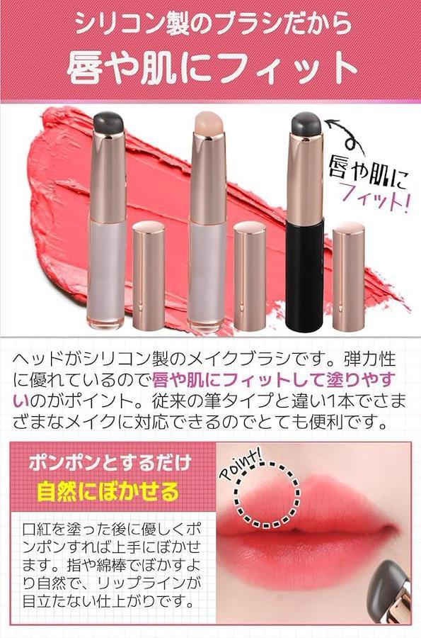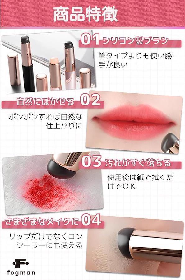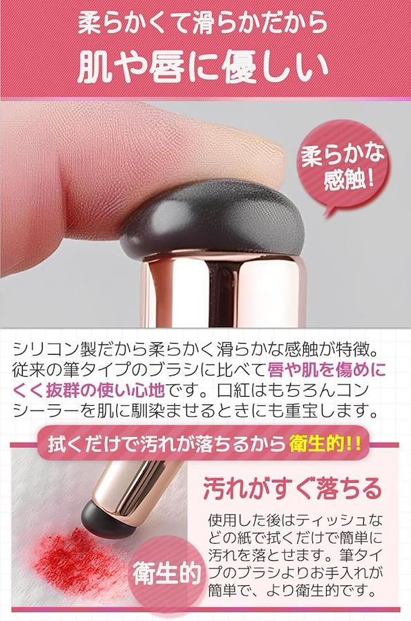 「商品特徴」(1)シリコン製ブラシ :筆タイプよりも使い勝手が良い /(2)自然にぼかせる :ポンポンすれば自然な仕上がりに /(3)汚れがすぐ落ちる :使用後は紙で拭くだけでOK /(4)さまざまなメイクに :リップだけでなくコンシーラーにも使える