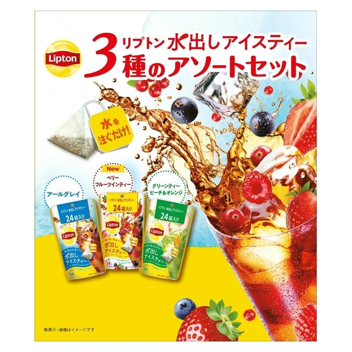 リプトンから人気の水出しアイスティー3種アソートセットがリニューアル。人気のアールグレイ、グリーンティーに加え、ピーチ、新たに6種のベリーの香りが広がる「ベリーフルーツインティー」もセット加わりました。