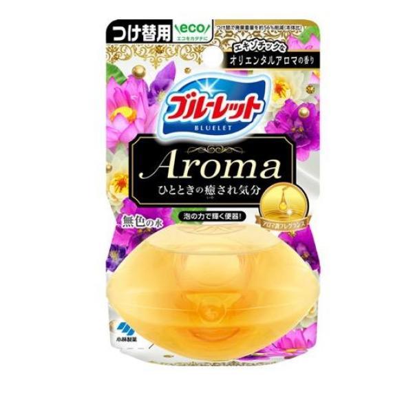 製品の特徴●小林製薬 液体ブルーレットおくだけAroma エキゾチックなオリエンタルアロマの香り つけ替用(※本品は付け替え用です。本体容器は付属しません。)●ひとときの癒され気分。アロマ調フレグランスを採用、香りがトイレ空間に漂います。●洗浄・防汚成分を配合。流すたびに便器表面をコートし、汚れの付着を抑えます。泡立ちながら、汚れを洗い流します。※使用環境・汚れの程度により、効果が異なることがあります。※水の流れない部分の汚れは落ちません。●便器の輝きを保ちます。●流れる水は無色です。●標準的な使用で約1ヶ月間(3~5週間)使用できます。(気温・水温・水量などにより、多少変化します。)●本品はタンク内の器具をいためず、浄化槽及び浄化槽内のバクテリアや防露タンクにも影響を与えません。●品名:トイレ用合成洗剤●用途:水洗トイレ用●液性:弱酸性~弱アルカリ性