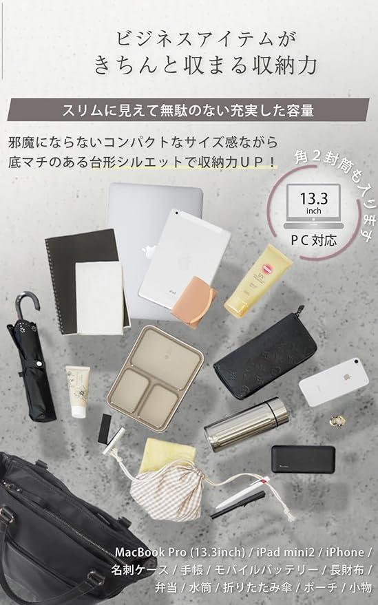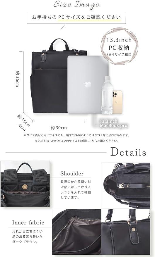 【ビジネスアイテムがきちんと収まる収納力】邪魔にならないコンパクトなサイズ感ながら、底マチのある台形シルエットで収納力アップ!13.3inchまでのPCが収納できるサイズになっています。?【女性を魅了する多彩な14ポケット】小物、PC、書類が分けれられて、誰でも収納上手になれる14個の多彩な小分けポケットがついています。?【ショルダーベルト・手持ちハンドルは収納可能】トートバッグとして使用する場合は、ベルト部分は背面ポケットに格納できます。ベルト部分には、収納しやすいように折り目がついています。反対にリュックとして使用する場合は、トートバッグのハンドル部分を背面ポケットに収納できる設定になっています。