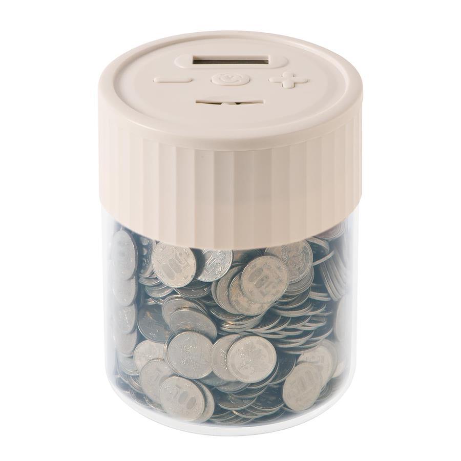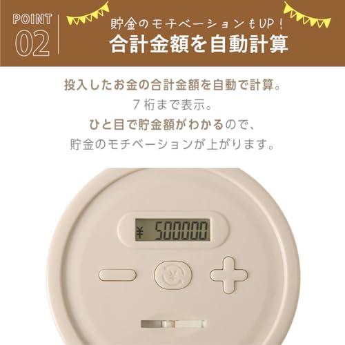 ?50万円貯められる貯金箱:高さ約18cm。500円玉1000枚で50万円貯められる貯金箱。 貯金に積極的になれる、ちょうど良いサイズ感です。 ?お客様の声から独自開発!硬貨の枚数がひと目でわかる:硬貨の種類ごとに枚数を確認できます。 手数料がかからない枚数で銀行に預けられるので、無駄な出費を抑えることができます。 ?合計金額を自動計算:投入したお金の合計金額を自動で計算。投入したお金の合計金額を自動で計算。 ひと目で貯金額がわかるので、貯金のモチベーションが上がります。他社品とは違い硬貨の金額単位の修正ができるから、間違って認識したときもワンタッチで修正が可能(かぞえる君オリジナル機能) ?全硬貨対応:1円玉~500円玉まで全ての硬貨を識別。 ※日本の硬貨のみ対応。 500円貯金や100円貯金、組み合わせ貯金もできます。 ?中が見えるから実感:中が見えるのでどれだけ貯まったか視覚的にも実感できます。 ?カワイイ「顔」に見えなくもない、「+」や「-」などの各種ボタンと硬貨投入口。お部屋に置いてもインテリアの邪魔にならない、どなたにも使いやすいデザインです。 シンプルなデザインのボタンで簡単に操作ができます。
