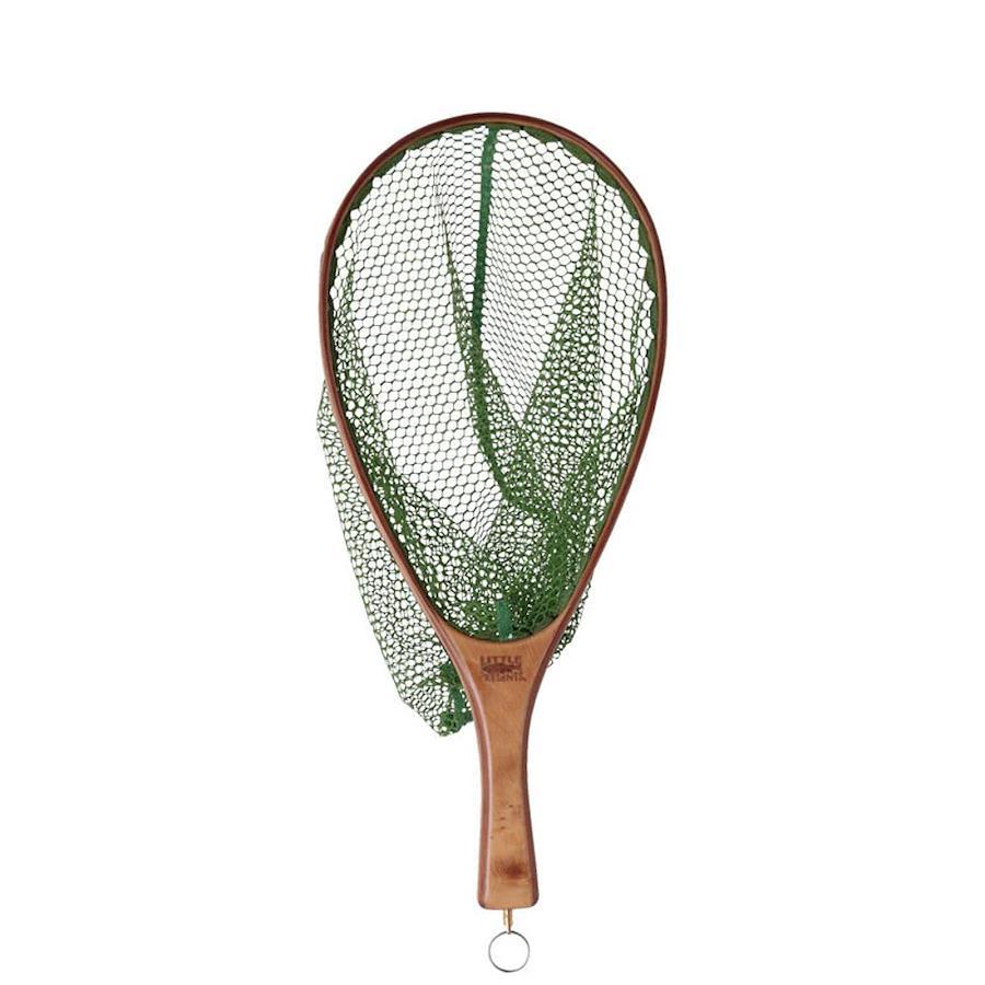 鮮やかなオリーブ色のネットは魚にやさしいPVCコーティング。魚へのダメージを軽減します。ネットの接合部分にはメッシュの生地を使用しました。テープ状の生地では、一旦フッキングするとなかなか外れず大変なストレスです。見た目は悪いですが、あえてメッシュ生地を使用することにより、フッキングしても比較的外れやすいようにしました。内径約30cmのウッドフレームの軽量ランディングネットです。魚をおけば尺あるかどうかの目安になります。尺イワナ(尺ヤマメ)ネットです。製品はマット調になります。