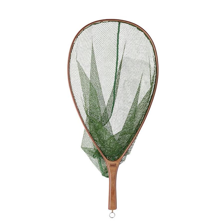 鮮やかなオリーブ色のネットは魚にやさしいPVCコーティング。魚へのダメージを軽減します。ネットの接合部分にはメッシュの生地を使用しました。テープ状の生地では、一旦フッキングするとなかなか外れず大変なストレスです。見た目は悪いですが、あえてメッシュ生地を使用することにより、フッキングしても比較的外れやすいようにしました。内径約59cmのウッドフレームの軽量ランディングネットです。目指せ2尺。狙いはサクラマス、本流レインボウ、ブラウン等のビッグトラウトです。製品はマット調になります。