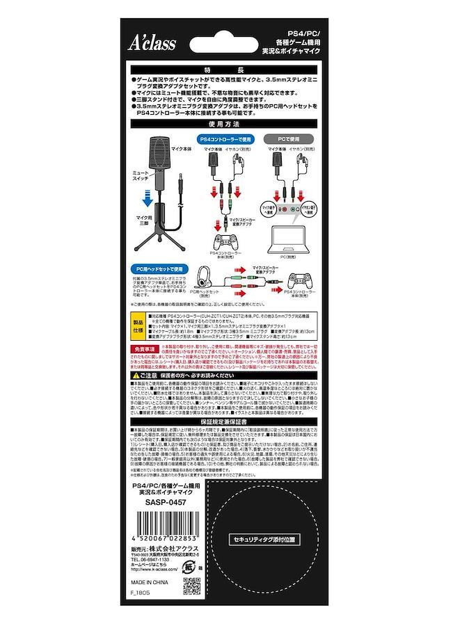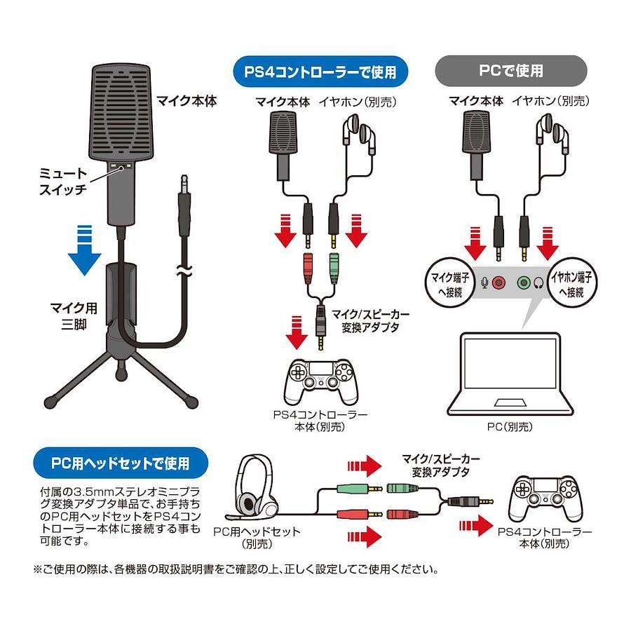 PS4本体やPCを使ってゲーム実況やボイスチャットが簡単にできるマイクスタンドセットです。使い方は本製品をPS4コントローラー本体、またはPCに接続するだけ。必要に応じてお手持ちにイヤホンも接続可能。3.5mmステレオミニプラグ変換プラグは、PC用ヘッドセット (ピンク・緑コネクタ) をPS4コントローラー本体で使用するのにも利用可能で、使い慣れたPC用ヘッドセットをPS4本体で使用できます。マイクミュート機能搭載で、不意な物音にも素早く対応できます。三脚スタンド付きなので、マイクを自由に角度調整できます。