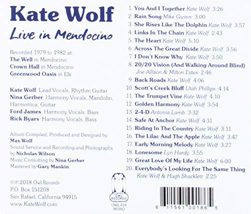 Kate Wolf had a great affinity for the California coast, and she frequently performed in Mendocino County venues in the middle years of her career. When Nicholas Wilson told Kate's family that he had recorded many of these shows, we were excited about the prospect of releasing them. Nick's 15 hours of tapes were made directly from the soundboard at each concert, and he painstakingly digitized nearly 200 song performances. We then turned to Nina Gerber, Kate's long time accompanist, who had compiled two other posthumous Kate Wolf collections. Her deep and intimate familiarity with Kate's music, along with a desire for quality that matched Kate's, resulted in a selection of 20 tracks that we feel beautifully represent Kate. We're particularly delighted about the inclusion of three previously unreleased Kate Wolf songs