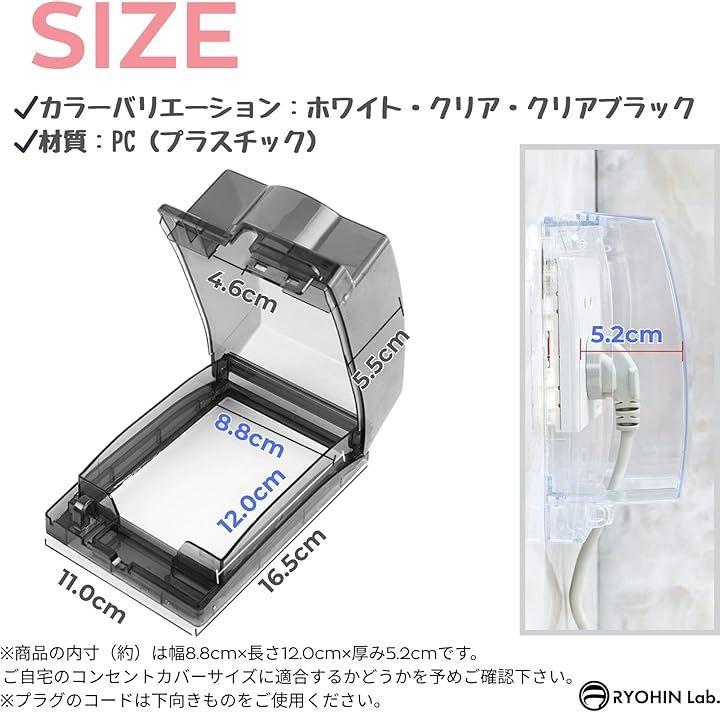 「商品内容」コンセントカバー1個、外寸(約):幅11.0cmx長さ16.5cmx厚み5.5cm、内寸(約):幅8.8cmx長さ12.0cmx厚み5.2cm、カラーバリエーション:ホワイト・クリア・クリアブラック、素材:PC(プラスチック)*南京錠は付属しておりません。