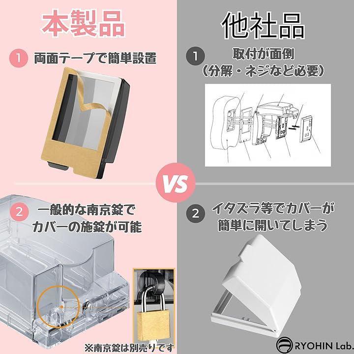「特徴比較」このコンセントカバーは、両面テープで簡単に取り付けられるため、他の製品と比べて設置が手軽です。