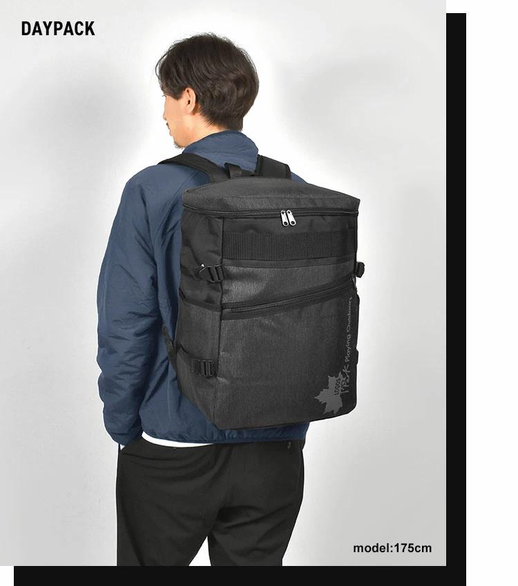 【大型デイパック 30L】通勤通学や旅行、アウトドアなど様々なシーンにオススメな大型リュックサック。約30L入る大容量サイズのスクエア型なので荷物を沢山収納することができます。生地には撥水機能が付いているので突然の雨でも安心して使用できます。