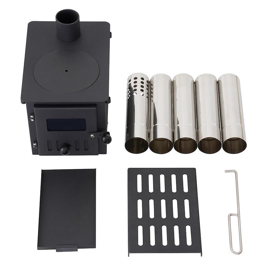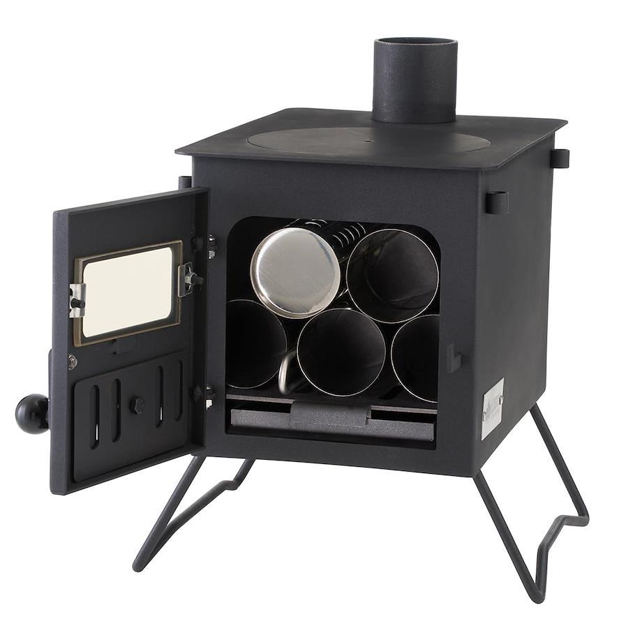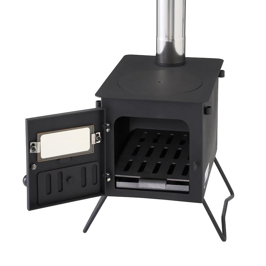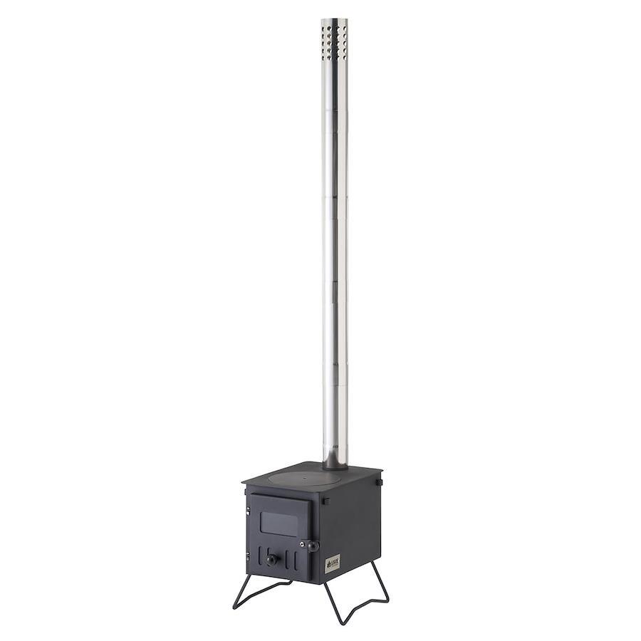 総重量:(約)7kg サイズ: [本体](約)幅27.5×奥行33×高さ53/128cm [煙突](約)全長99×直径6cm 収納サイズ:(約)縦21.5×横32.5×高さ26cm 構成:本体、煙突×5、ロストル、灰受け、トッププレートリフター 主素材:スチール、ステンレス 性能/特長: ・火力調節可能 ・ロストル付きで燃焼効率UP ・コンパクト収納 ・取り外し式トッププレートで調理器具の直火加熱可能 ・火の粉が飛び散りにくいスパークアレスター標準装備