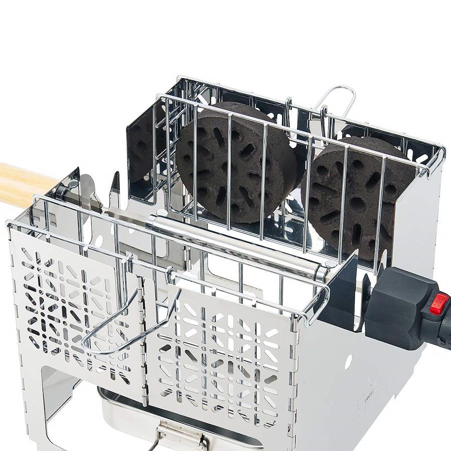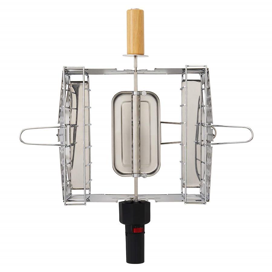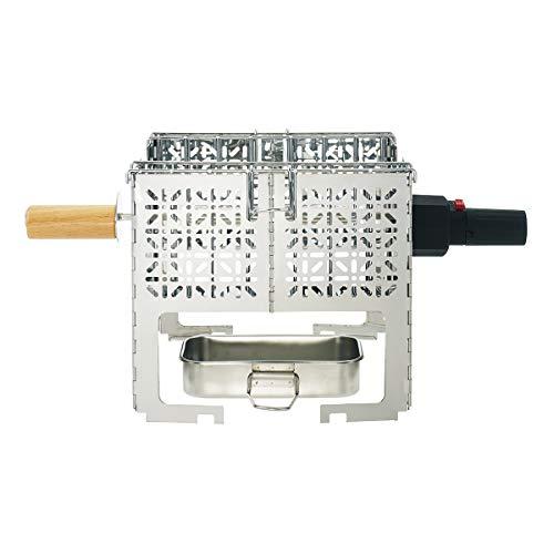 総重量:(約)3.0kgサイズ:(約)幅56.5×奥行52×高さ27.5cm本体部サイズ:幅30×奥行32.5×高さ27cm調理有効長:(約)20cmチャコラック内寸:(約)幅30×奥行4×高さ14cm収納サイズ:(約)幅39×奥行27×高さ14cm回転バー耐荷重:(約)1kg電 源:単一アルカリ乾電池×1pcs(別売)構 成:本体、回転バー、モーターグリップ、スキュア×2、受け皿、チャコラック×2、収納バッグ主素材:ステンレス、スチール、木材、ABS
