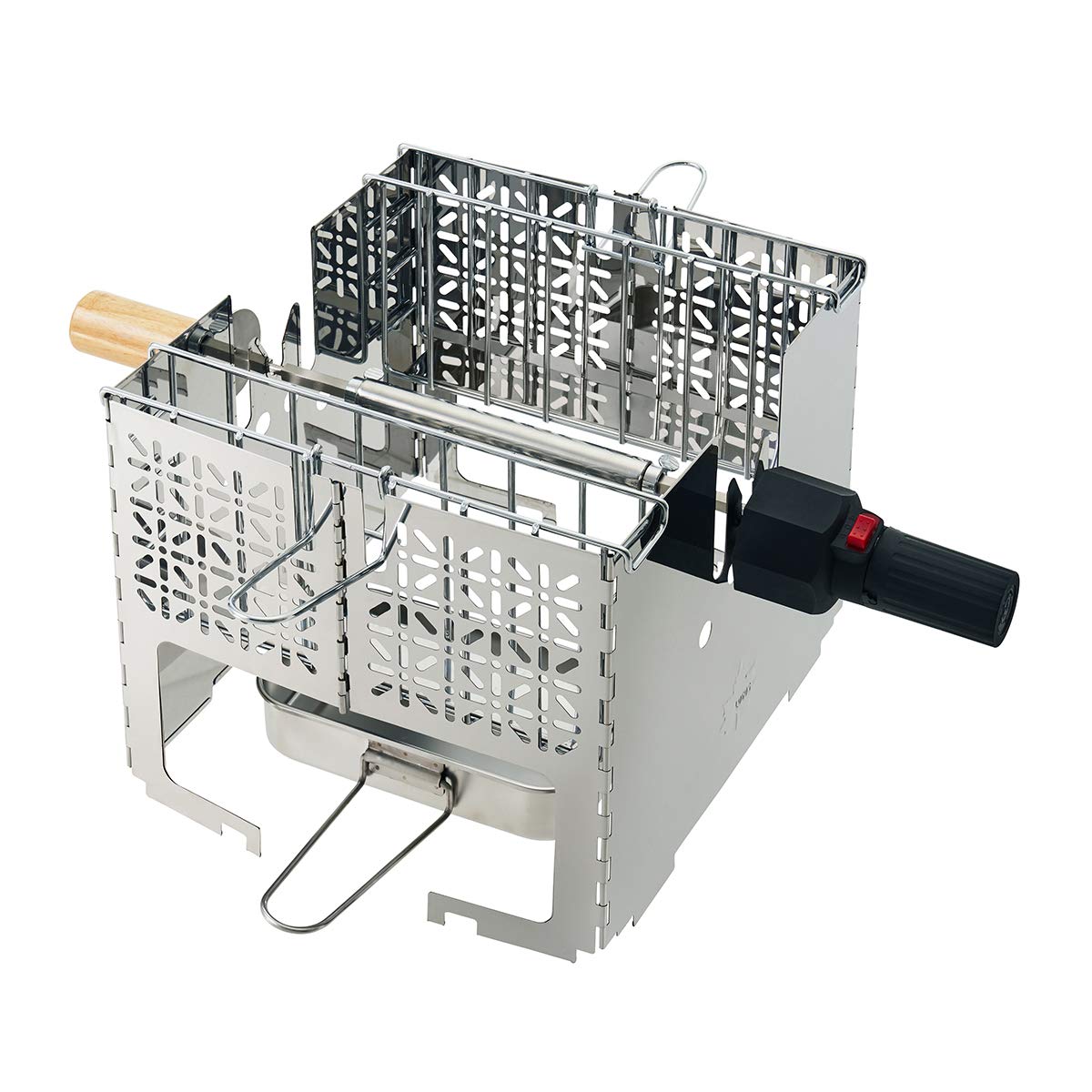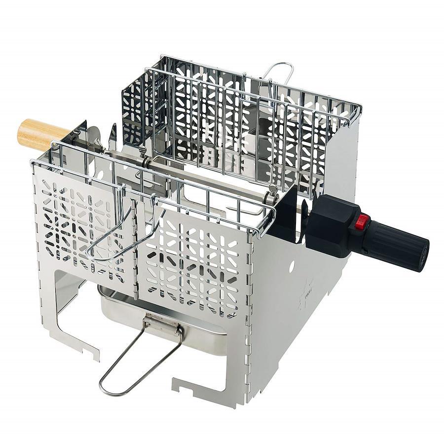 ●バウムクーヘンを作ろう!●金属製のテーブルやグリルにセットして楽しみます●回転バーに生地を掛けながら両サイドから過熱することで、バウムクーヘンが徐々に焼きあがります●お肉の丸焼きやシュラスコも楽しめます●収納バッグ付き