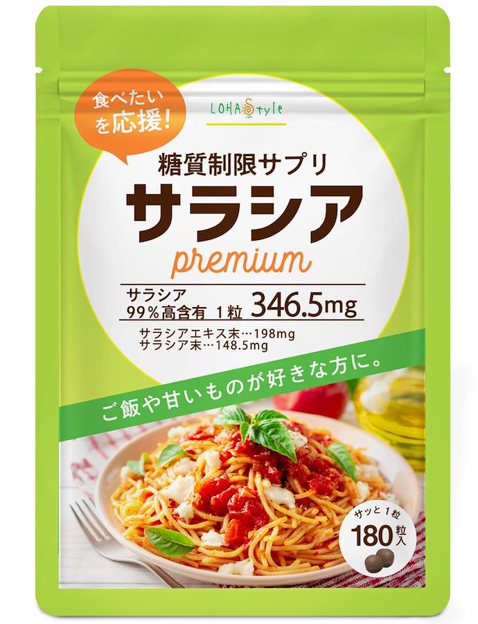 ??1袋「62,370mg」サラシア量業界最大量にパワーアップ!サラシア含有量346.5mg/粒 (サラシアエキス末198mg サラシア末148.5mg)圧倒的な含有量。だからサラシアをしっかり摂りたい方に選ばれています ??サラシアを濃縮したエキス末量を増量!サラシア末だけでなく、サラシアを濃縮したエキス末の配合量もUP。サポニンなど重要な成分が豊富に含まれています。 ??サラシア99%なのでダイエットサポートにオススメ!サプリを作るには、サプリを固める材料が必要です。沢山の栄養を入れるには2粒に分けるか、1粒を大きくするしかありませんでした。もっと手軽に飲んでほしいと考えたLOHAStyleは、試作を重ねサラシア99%のサプリ作りに成功しました!業界最大のサラシア量をお試し下さい。 ??サラシアに含まれるサラシノール、コタノールで糖・脂サポート。!20種以上のサラシアの中から、成分サラシノールやコタノールが豊富なサラシアレチキュラータを使用。インドやスリランカの雨の多い熱帯雨林に自生しているサラシアは、実感力の高さから奇跡の植物と呼ばれています。 ??「サラシアPremium」は、こんな方にオススメです。炭水化物や甘いものが好き!外食の糖質が気になる…。糖質制限をしている…。