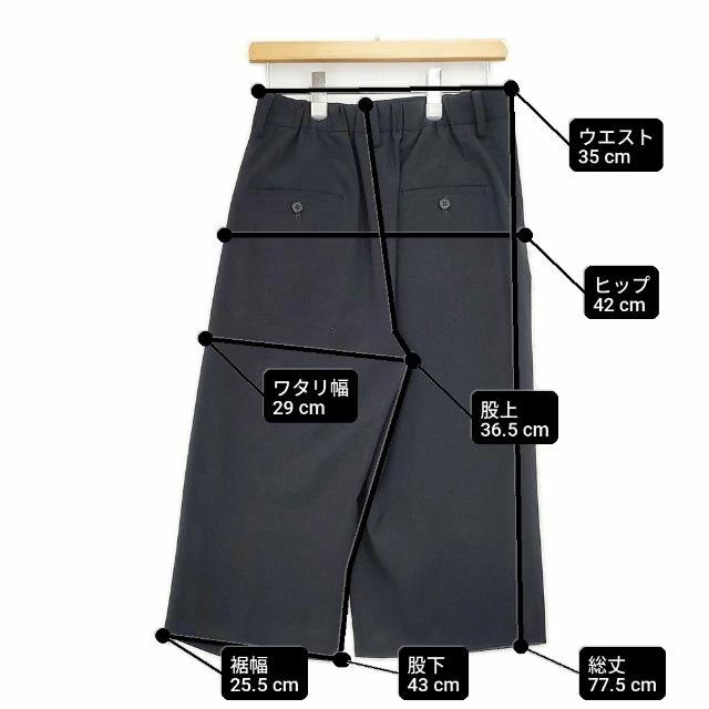 | 実寸サイズ | 総丈:約77.5cm ウエスト:約35cm ウエスト最長:約42cm 股上:約36.5cm 股下:約43cm ヒップ:約42cm ワタリ幅:約29cm 裾幅:約25.5cm 備考 裾幅:左側伸ばした状態:約32cm 右:約27cm ※採寸画像がある商品はハンガーに吊るした状態での計測のため、平置きでの採寸とは差が生じる場合がございます。平置きでの実寸サイズをご希望の場合は、ご購入前に必ずご質問ください。 ※記載以外のサイズが合わないことを理由とした返品はできませんので、 記載部分以外で実寸サイズの気になる箇所があれば必ず購入前にご質問ください。 |