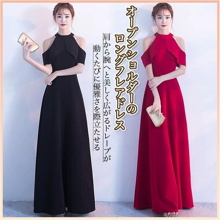 肩から腕へと流れるように美しく広がるドレープが、動くたびに優雅さを際立たせるオープンショルダーのロングフレアドレスです。