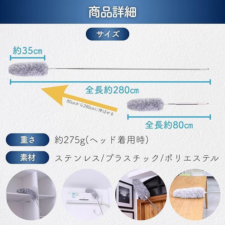 最短80cmから最長2.8mまで伸びる。軽量なので疲れにくく、冷蔵庫の上や棚の上・照明・冷房・窓・カーテンレールの上・天井・壁面など、手が届かない高い場所のお掃除に大活躍です。