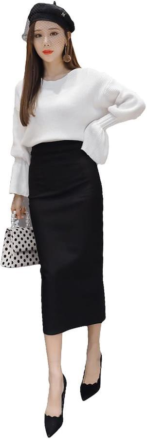 合わせやすく細見えが叶う漆黒ブラックのタイトスカート。