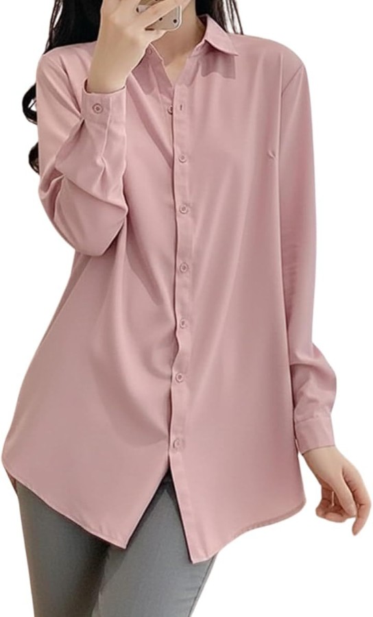 Long-sleeved, plain, roll-up sleeve shirt/blouse for women, with a regular collar. Suitable for spring, summer, autumn, and winter. Pocketless design.