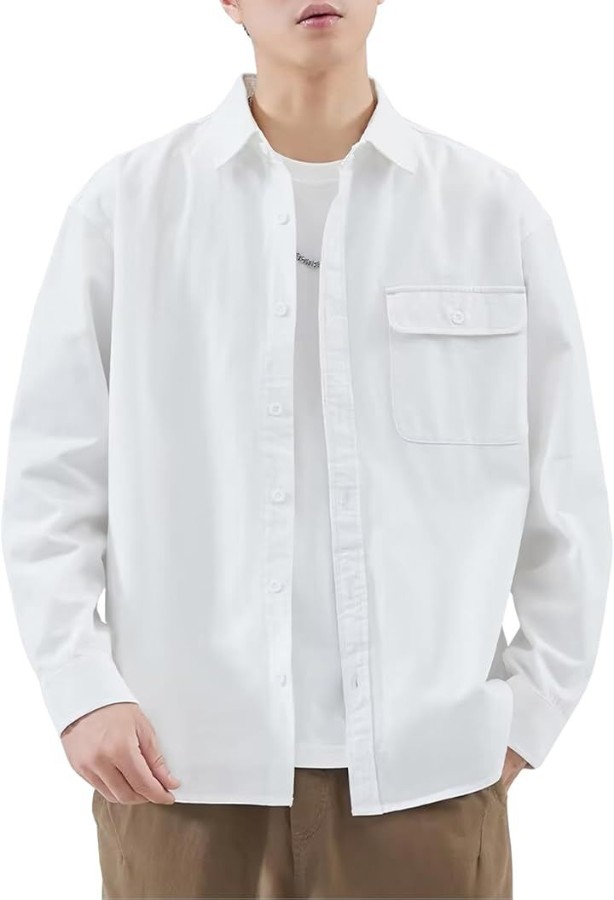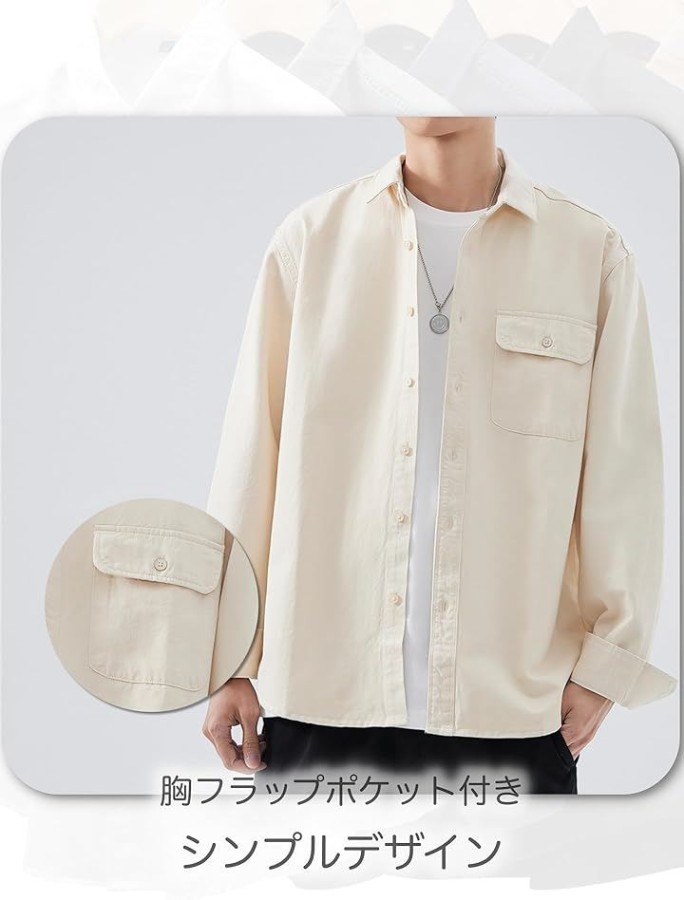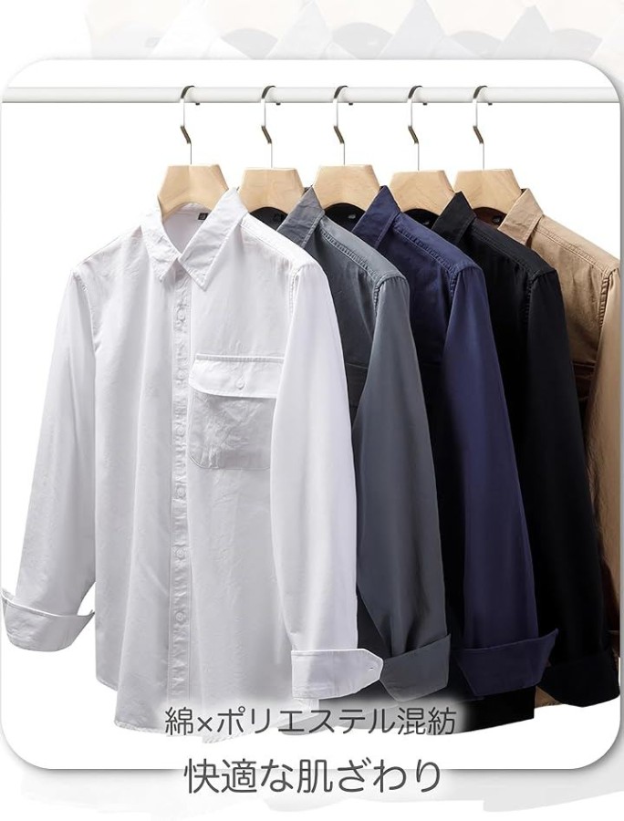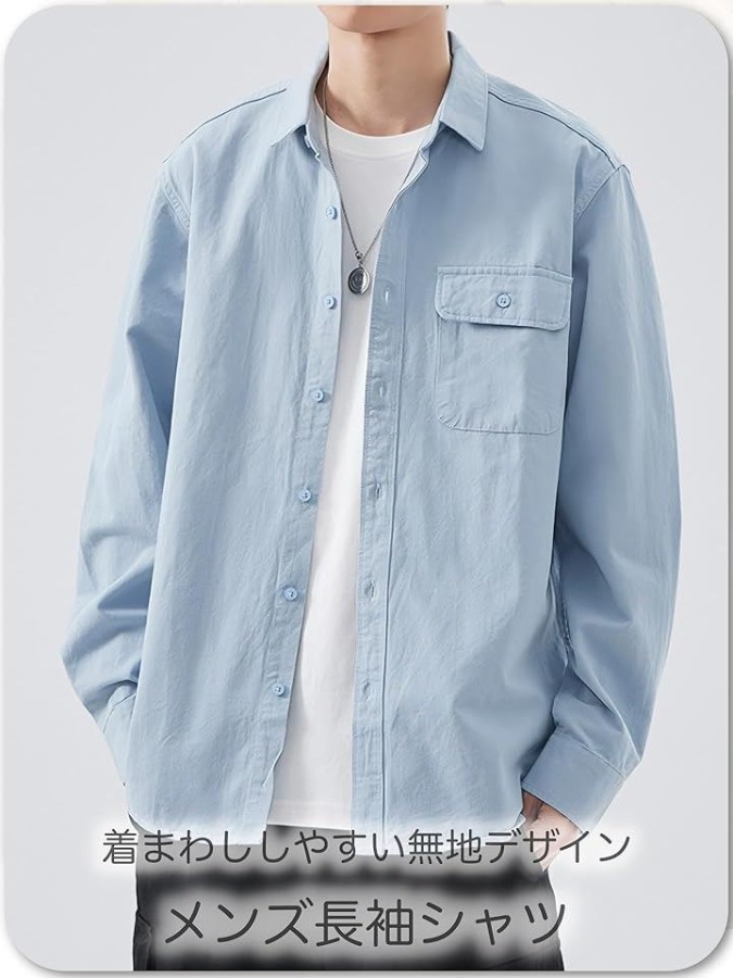 シンプルで着回しやすい無地デザインのメンズ長袖シャツ。