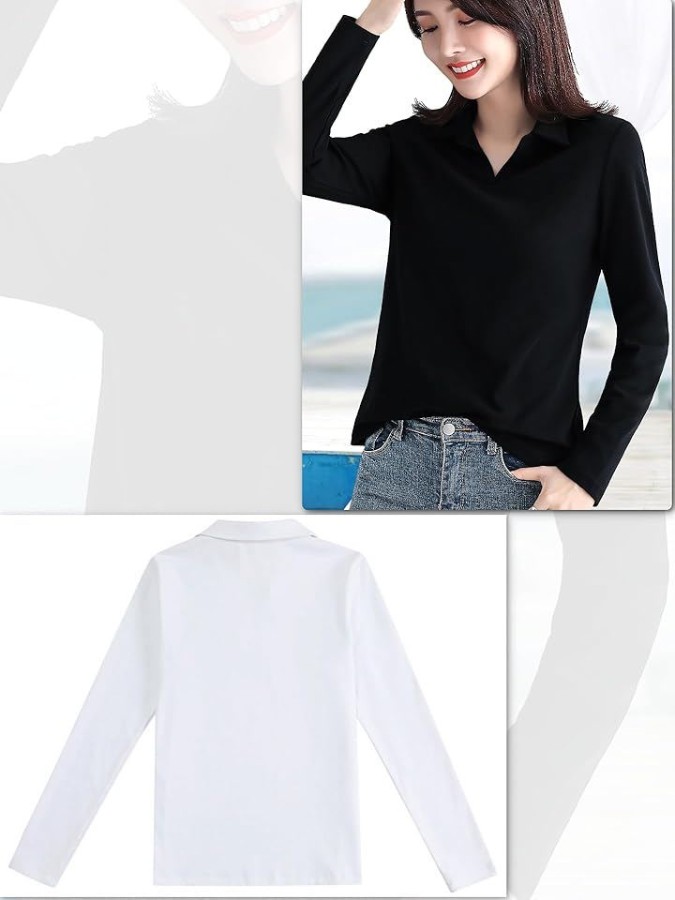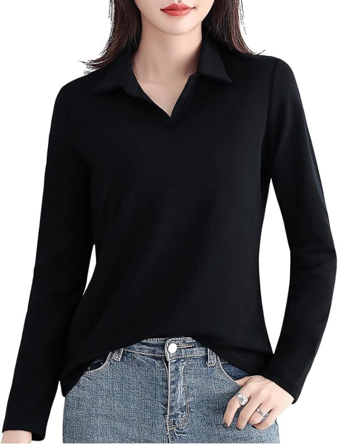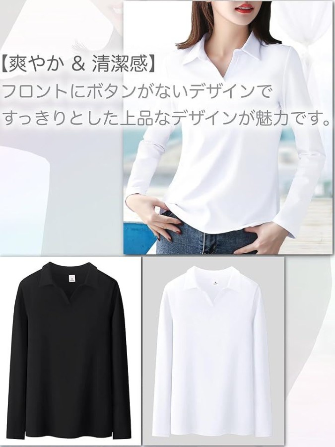 「 [ブブ オーハナ] 長袖 ポロTシャツ 無地 襟付き Vネック ボタンなし Tシャツ ポロシャツ ストレッチ性 レディース 」