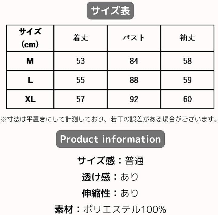 「サイズ」 「M」 着丈53cm/バスト84cm/袖丈58cm、「L」 着丈55cm/バスト88cm/袖丈59cm、「XL」 着丈57cm/バスト92cm/袖丈60cm *寸法は平置きにして計測しており、若干の誤差がある場合がございます。