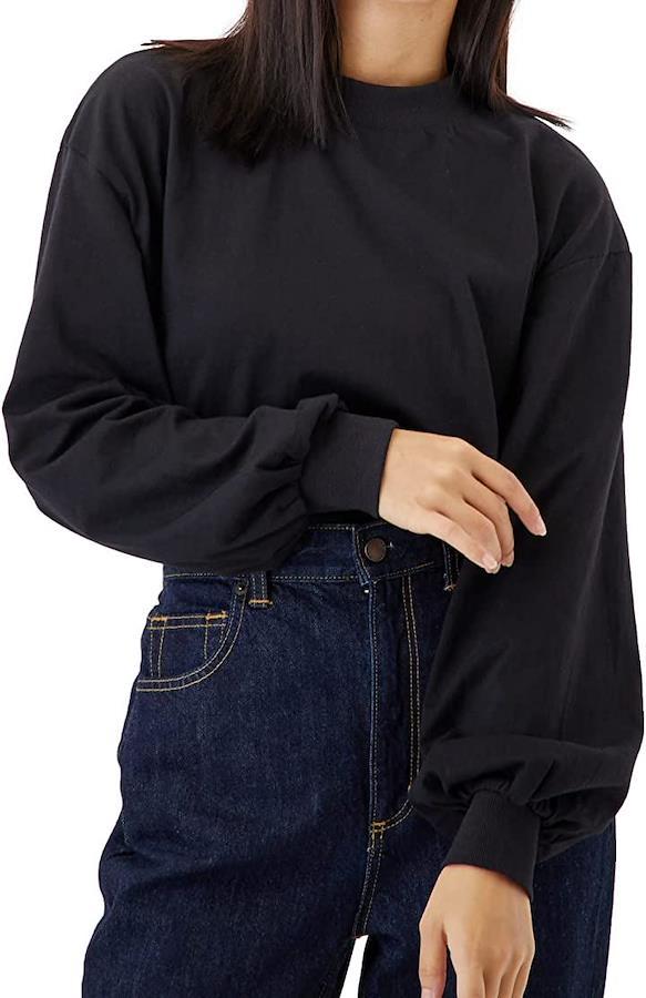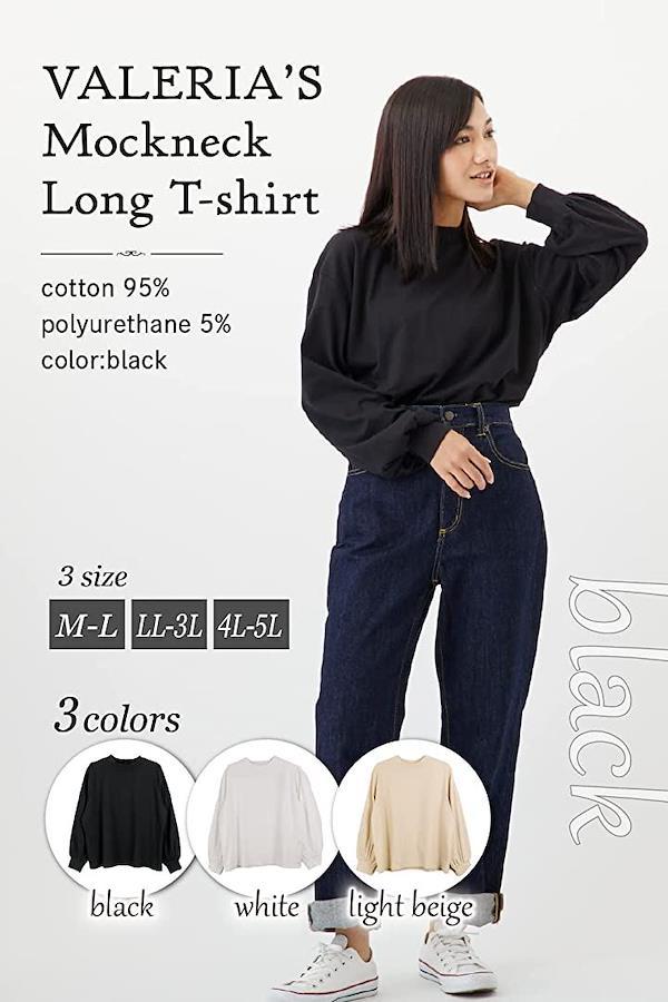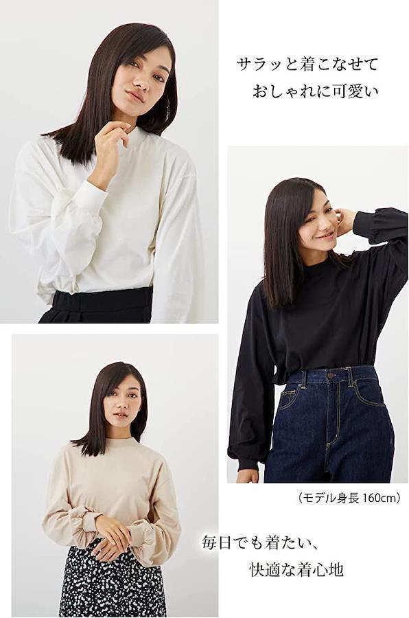 ・「顔周りがスッキリ見えるプチハイネック」シンプルで飽きのこないデザインがデイリー使いしやすい、モックネックボリューム袖ロンT。