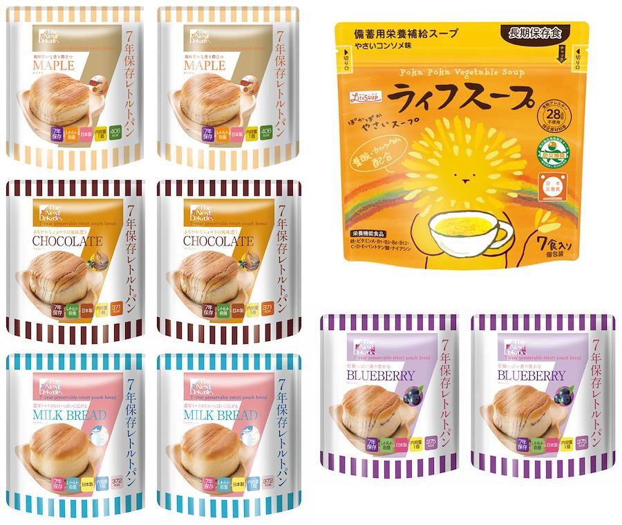 【商品内容】備蓄用栄養補給ライフスープ 7食入+レトルトパン8食入(ミルクブレッド、チョコレート、ブルーベリー、メープル各2食)これまでの備蓄に足りなかったのは「栄養」でした。食料備蓄は単に「空腹を満たせればいい」というわけではなく、「栄養を管理できる備蓄」が必須条件です。「ライフスープ+レトルトパン セット」は非常時・災害時でも被災者の栄養バランスを整え健康維持を目的とした長期保存食セットです。アウトドア、キャンプ、登山の行動食としてもおすすめです。【賞味期限】ライフスープ:製造より5年間/レトルトパン:製造より7年間 ※流通の過程で何か月か経過しております。【原材料名】ライフスープ:デキストリン(国内製造)、野菜エキスパウダー(馬鈴薯、玉葱、人参)、食塩、砂糖、酵母エキス、食物繊維、セロリパウダー/炭酸Ca、ピロリン酸第二鉄、V.C、V.E、ナイアシン、パントテン酸Ca、V.B1、V.B6、V.B2、V.A、葉酸、V.D、V.B12【原材料名】●ミルクブレッド:小?粉(国内製造、韓国製造)、フラワーペースト、ショートニング、砂糖、卵、ホエイパウダー、 マーガリン、パン酵母、異性化液糖、食塩、発芽玄米パン酵母種/加工でん粉、香料、酒精、増粘 多糖類、(一部に小?・卵・乳成分・大豆・りんごを含む) ●チョコレート:小?粉(国内製造、韓国製造)、チョコレートフラワーペースト、ショートニング、砂糖、卵、ホエ イパウダー、マーガリン、パン酵母、異性化液糖、食塩、発芽玄米パン酵母種/加工でん粉、香 料、PH調整剤、増粘多糖類、(一部に小?・卵・乳成分・大豆・りんごを含む)●ブルーベリー:小?粉(国内製造、韓国製造)、ブルーベリーフィリング、ショートニング、砂糖、卵、ホエイパウ ダー、マーガリン、パン酵母、異性化液糖、食塩、発芽玄米パン酵母種/加工でん粉、ゲル化剤 (増粘多糖類)、香料、着色料(クチナシ)、酸味料(クエン酸)、PH調整剤、リン酸 Ca、(一部に小 ?・卵・乳成分・大豆・りんごを含む) ●メープル:小?粉(国内製造、韓国製造)、メープル風味フラワーペースト、ショートニング、砂糖、卵、ホエ イパウダー、マーガリン、パン酵母、異性化液糖、食塩、発芽玄米パン酵母種/加工でん粉、香 料、酒精、増粘多糖類、カラメル色素(一部に小?・卵・乳成分・大豆・りんごを含む)※商品のデザインは予告なく変更する場合がありますのでご了承ください。【重要】メーカーによる商品リニューアルに伴いパッケージ(内容量も含む)変更が行われた場合、新パッケージでお届け致します事ご了承願います。
