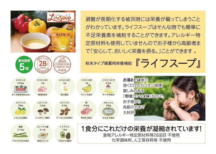 食料備蓄は単に「空腹を満たせればいい」というわけではなく、「栄養を管理できる備蓄」が必須条件です。「ライフスープ+レトルトパン セット」は非常時・災害時でも被災者の栄養バランスを整え健康維持を目的とした長期保存食セットです。【原材料名】ライフスープ:デキストリン(国内製造)、野菜エキスパウダー、食塩、砂糖、酵母エキス、食物繊維、香辛料/炭酸Ca、ピロリン酸第二鉄、V.C、V.E、ナイアシン、パントテン酸Ca、V.B1、V.B6、V.B2、V.A、葉酸、V.D、V.B12レトルトパン●ミルクブレッド:小?粉(国内製造、韓国製造)、フラワーペースト、ショートニング、砂糖、卵、ホエイパウダー、 マーガリン、パン酵母、異性化液糖、食塩、発芽玄米パン酵母種/加工でん粉、香料、酒精、増粘 多糖類、(一部に小?・卵・乳成分・大豆・りんごを含む)●チョコレート:小?粉(国内製造、韓国製造)、チョコレートフラワーペースト、ショートニング、砂糖、卵、ホエ イパウダー、マーガリン、パン酵母、異性化液糖、食塩、発芽玄米パン酵母種/加工でん粉、香 料、PH調整剤、増粘多糖類、(一部に小?・卵・乳成分・大豆・りんごを含む)●ブルーベリー:小?粉(国内製造、韓国製造)、ブルーベリーフィリング、ショートニング、砂糖、卵、ホエイパウ ダー、マーガリン、パン酵母、異性化液糖、食塩、発芽玄米パン酵母種/加工でん粉、ゲル化剤 (増粘多糖類)、香料、着色料(クチナシ)、酸味料(クエン酸)、PH調整剤、リン酸 Ca、(一部に小 ?・卵・乳成分・大豆・りんごを含む)●メープル:小?粉(国内製造、韓国製造)、メープル風味フラワーペースト、ショートニング、砂糖、卵、ホエ イパウダー、マーガリン、パン酵母、異性化液糖、食塩、発芽玄米パン酵母種/加工でん粉、香 料、酒精、増粘多糖類、カラメル色素(一部に小?・卵・乳成分・大豆・りんごを含む)