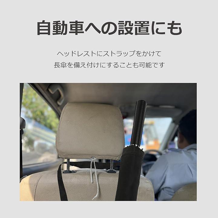 「自動車の設置にも」ヘッドレストにストラップをかけて、長傘を備え付けにすることも可能です