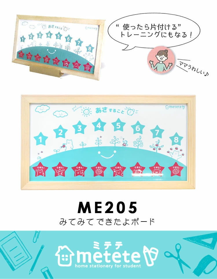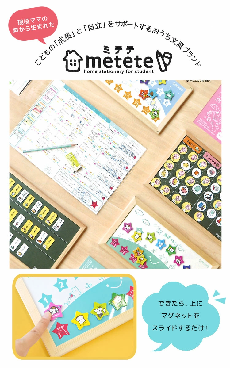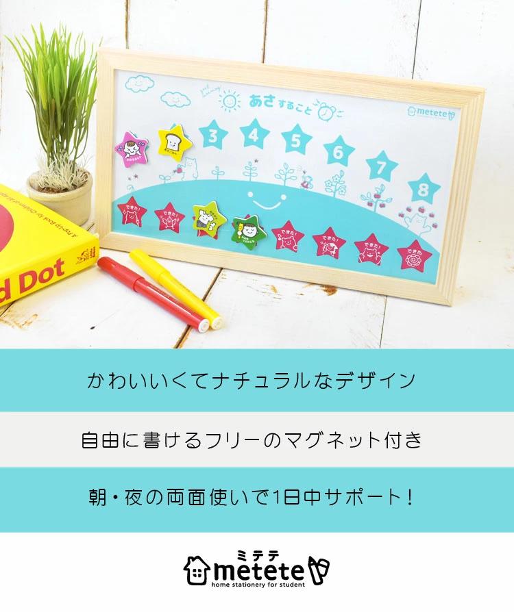 やるべきことがすすんでできる!やるべきことが見てわかる!【metete みてみてできたよボード】のご紹介。両面タイプで「朝」「夜」と分けて使えます。用意ができたら、指で簡単にスライドさせればok!1つずつ確認しながら確実にこなせちゃう♪簡単で、ゲーム感覚に楽しめ、自然と毎日やすことが覚えられます。自由に書き込めるフリーのマグネットが様々なシーンに対応。楽しく自立できるトレーニングを始めよう♪