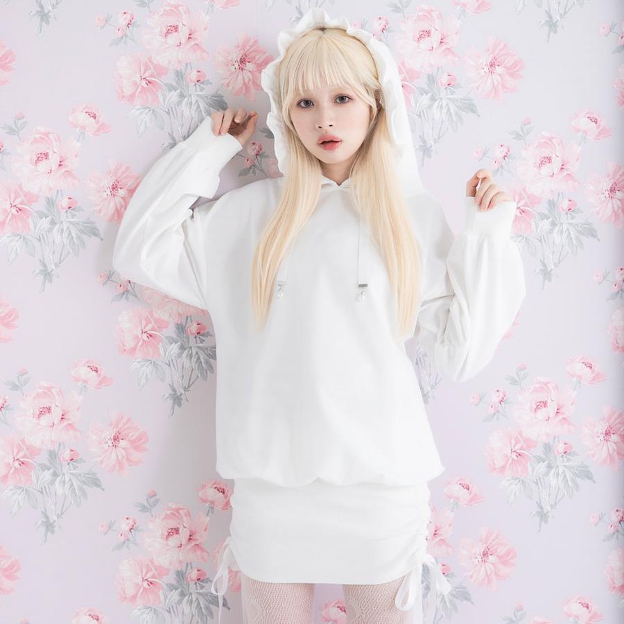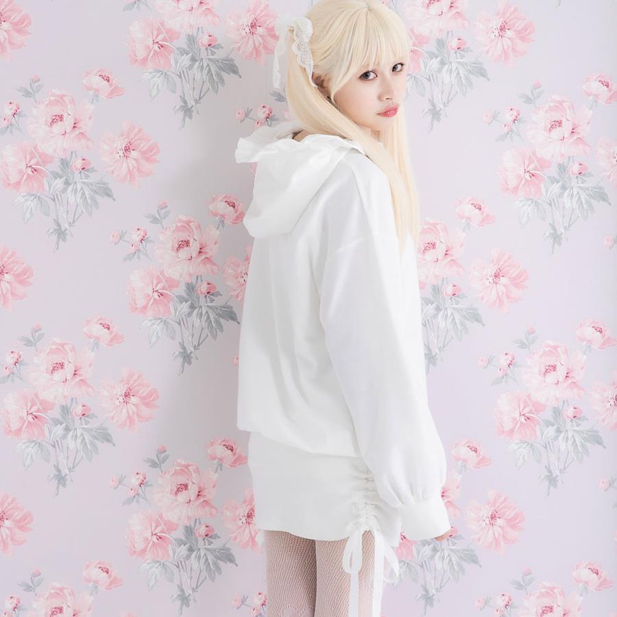 襟が選べる♪トレンドライクなスウェットミニワンピースのご紹介。【デザイン】ゆる×ピタな絶妙あざとシルエットがトレンド感抜群なスウェットワンピースです。フード襟かセーラー襟の2種類からお好みの襟タイプを選べます♪ボリューミーなお袖やゆるっと脱力感のある上半身と、ピタッと引き締めてくれるミニ丈シルエットがメリハリをつけてくれてスタイルUP効果も抜群◎スウェット生地でラフな印象なのに、可愛いらしさ+女っぽく着れちゃいます♪パーカーのリボン先にはパールチャームがついているので、コーデのワンポイントに◎伸縮性のある生地なので、被りで着用いただける仕様です。スカートのサイドドロスト部分はお好みでクシュっと感を調整して頂けます。