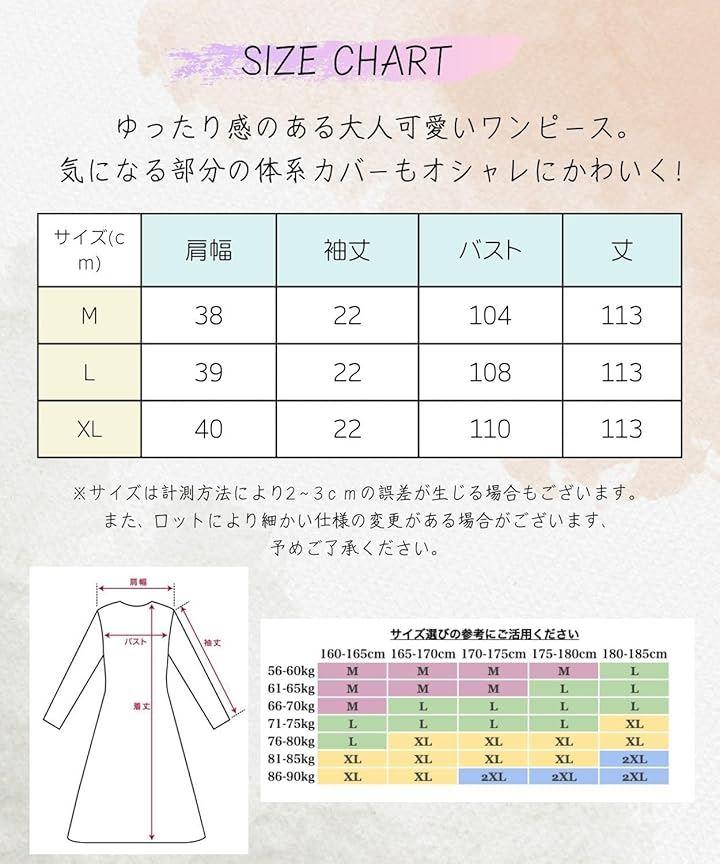 「M」肩幅38/袖丈22/バスト104/丈113 「L」肩幅39/袖丈22/バスト108/丈113 「XL」肩幅40/袖丈22/バスト110/丈113