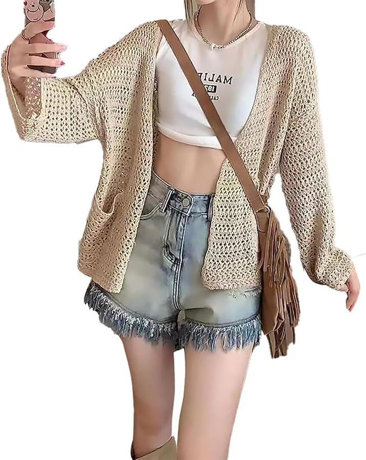ざっくりとした透かし編みが特徴で、軽やかな印象を演出します。