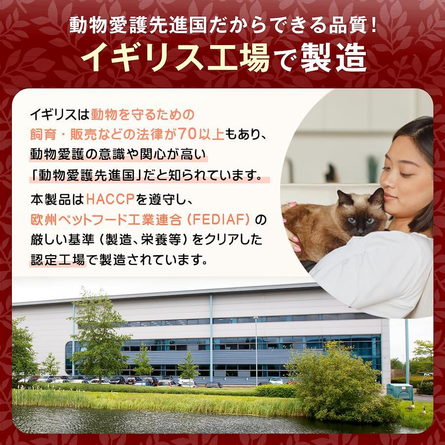 本製品はHACCP(Hazard Analysis and Critical Control Point)を遵守し、欧州ペットフード工業連合(FEDIAF)の厳しい基準(製造、栄養等)をクリアした認定工場で製造されています。