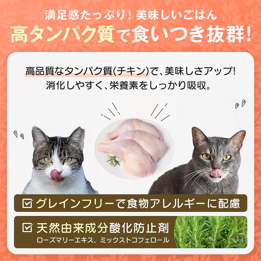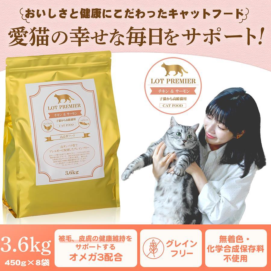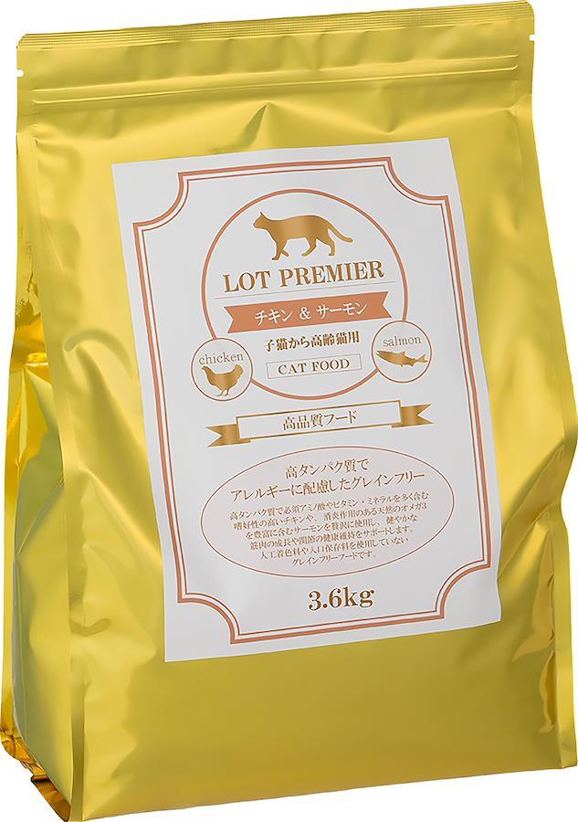 ●LOT PREMIERチキン&サーモンは、必須アミノ酸やビタミン、ミネラルを豊富に含む低脂肪で高タンパク質なチキンや、消炎作用があり皮膚や被毛のコンディションを整え、関節の健康維持をサポートする天然のオメガ3が多く含まれるサーモンを贅沢に使用したフードです。 グレインフリーで、グレインに敏感な愛猫や穀物不耐性の愛猫にも安心して給与できるよう配慮された、天然由来を保存料とする人工着色料不使用の高品質なフードです。