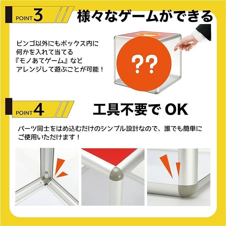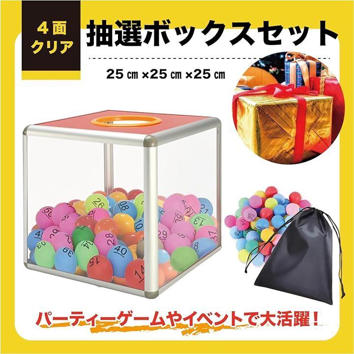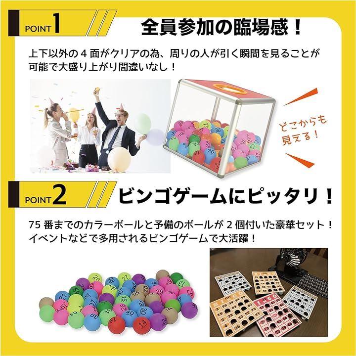 1~75番まであるビンゴ用に抽選ボールも予備含め77個同梱、その他にも側面4面がスケルトンなので「モノあてゲーム」などの別ゲームを行うことも可能。周りの人全員が引く瞬間を見ることができるので盛り上がること間違いなし。