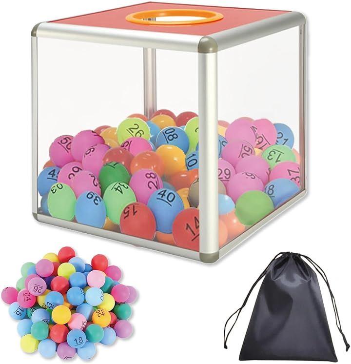 セット内容:抽選ボックス本体x1個、ビンゴ用ボール77個(1~75番+予備ボール2個) 収納袋x1枚