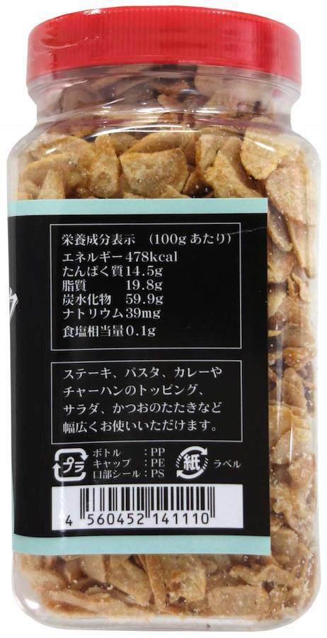 ベトナム産にんにくを使用した商品。厚めのスライスタイプのため、食べ応え抜群。140gの容量と口の広い蓋で遠慮なく贅沢に使えます。ステーキ、ハンバーグ、サラダなどのトッピングにも。