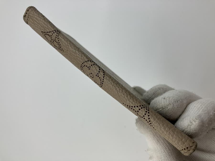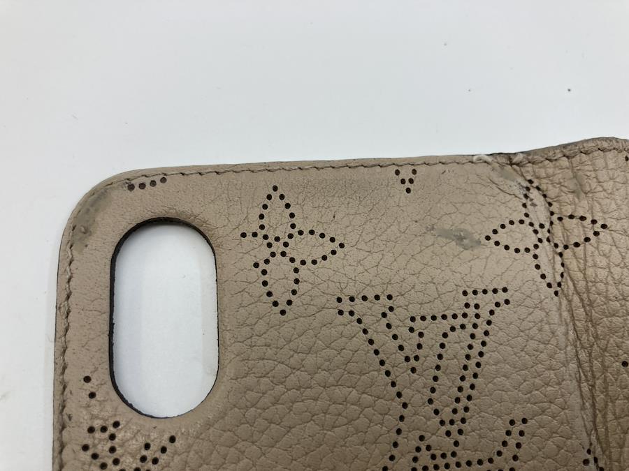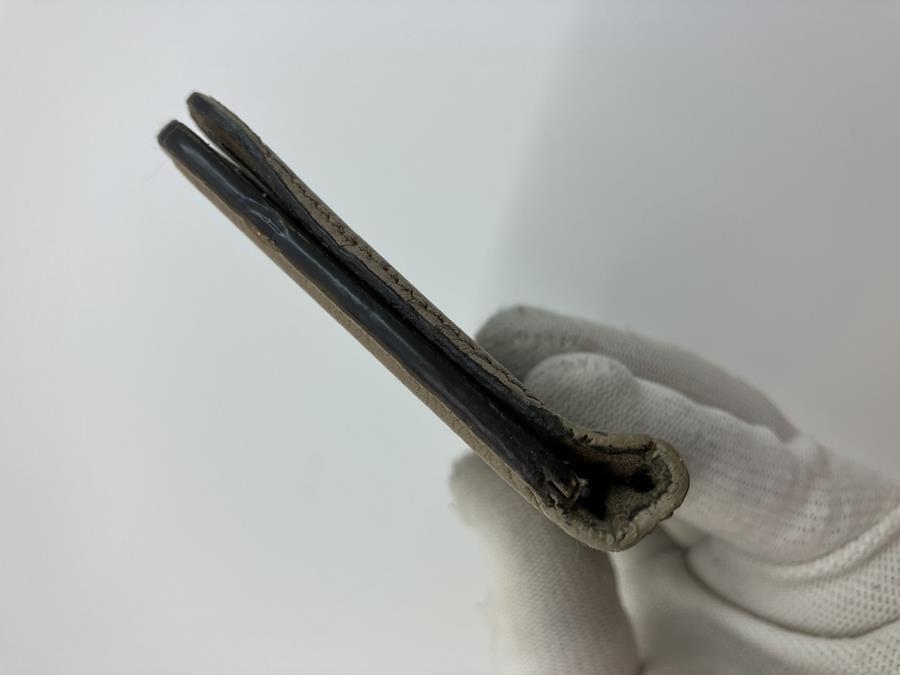 全体的に使用感強め:スレ・汚れ・縁の擦れ、型崩れあり。内側カードポケット周辺に汚れ・黒ずみ・接着剤跡/めくれ、カメラ穴まわりやフチに擦れ・小キズ、ヒンジ部分のライニング摩耗あり。使用自体は可能です。画像を必ずご確認ください。