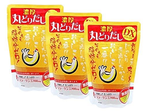 【商品名】食塩無添加 濃厚 日本スープの丸どりだし(国産) 250g×3袋セット食品添加物無添加・無脂肪・食塩無添加の、国産鶏の甘い香りと味わい深いコクが楽しめる美味しい鶏ダシです。 保存や使い勝手が便利なレトルトパックタイプです。 ブイヨンの代わりに、ストレートから3倍に薄めてご利用ください。 冷凍庫が手狭な方、煮物やお鍋を中心にお使いの方にはお薦めです。天然の美味しさをそのままにをモットーに、厳選した素材を使い、手間暇を惜しまず、化学調味料等の添加物を一切加えず、 天然素材本来の味と香りをスープストックにギュギュっと濃縮して提供しております。【料理例】 和 風 : お味噌汁、炊き込み、おじや、御粥、お鍋、煮物、うどん 洋 風 : スープ、ポタージュ、カレー、シチュー、リゾット、ポトフ 中 華 : 中華スープ、麻婆豆腐、八宝菜、五目餡かけ、中華粥【原材料名】丸鶏(国産)、濃縮チキンだし【栄養成分】100g当たり エネルギー・・・15kcal たんぱく質・・・3.8g 脂質・・・0.0g 炭水化物・・・0.0g ナトリウム・・・110mg (食塩相当量・・・0.3g) コラーゲン・・・2.900mg